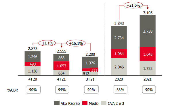 As vendas líquidas contratadas neste trimestre somaram R$ 1.575 milhões, valor 15% inferior ao registrado no 4T20 (R$ 1.860 milhões) e 15% superior do 3T21 (R$ 1.366 milhões).