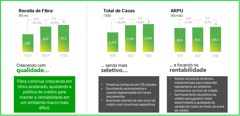 Assim, no comparativo anual, o resultado financeiro apresenta um crescimento de 54% na receita com operações de fibra e de aproximadamente 43% residências a mais com serviços da companhia.