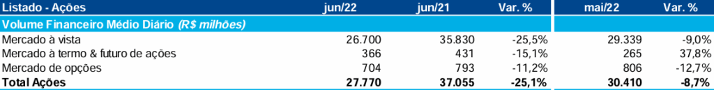 A B3 (B3SA3) reportou queda de 8,4% no volume diário de negociações no mês de junho de 2022 frente a junho de 2021. O volume financeiro médio diário registrado no mês passado foi de R$27,7 bilhões.