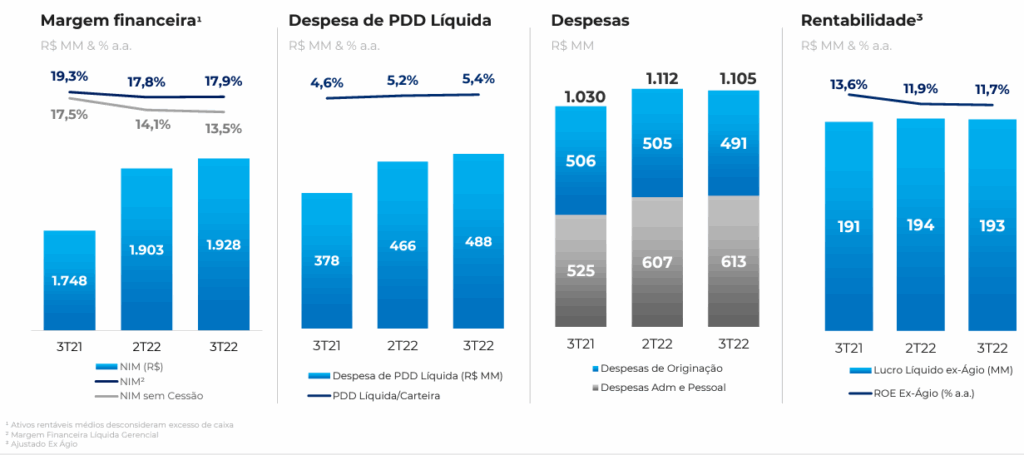 Enquanto isso, a margem financeira foi de R$ 1,928 bilhão, alta de 10% em relação ao 3T21 (R$1,748 bilhões).