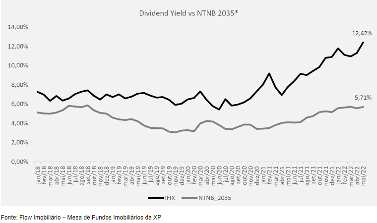 Além de atingir o maior nível dos últimos anos, o dividend yield do Ifix aumentou a distância dos rendimentos da NTN-B com vencimento em 2035 (Tesouro IPCA+ 2035).