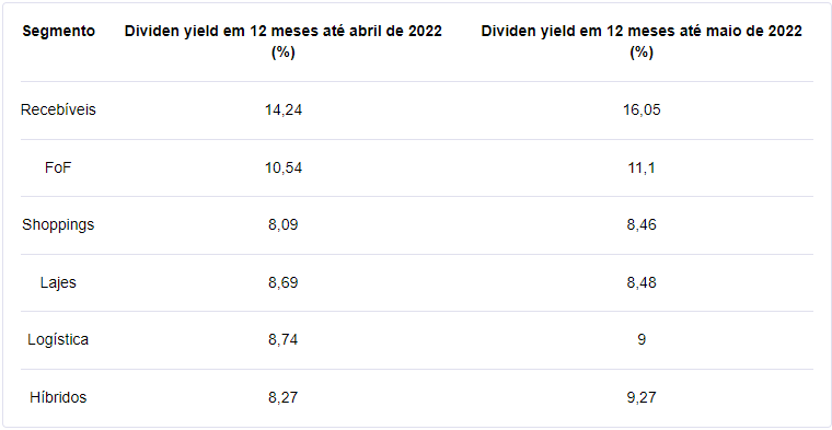 Em maio, o dividend yeld acumulado dos FIIs de “papel” atingiu 16,05%, de acordo com o relatório.