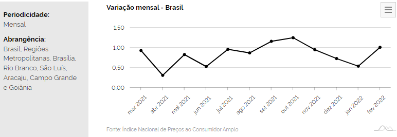 O IPCA subiu 1,01% em fevereiro, alta de 0,47 ponto percentual frente a janeiro (0,54%). Essa é a maior variação da inflação para um mês de fevereiro desde 2015, quando o índice foi de 1,22%. O Instituto Brasileiro de Geografia e Estatística (IBGE) divulgou as informações nesta sexta-feira (11).