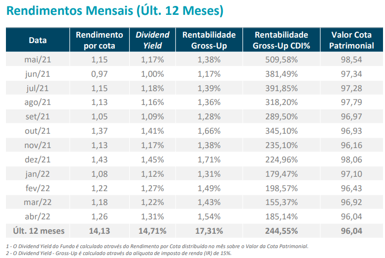 O FII distribuiu os rendimentos de abril em 17/05/2022 para os cotistas do IRDM com posição em 10/05/2022.