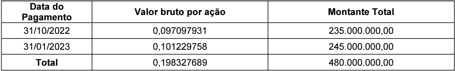 A TIM distribuirá os proventos em duas parcelas, sendo a primeira de R$235 milhões até 31.10.2022 e a segunda de R$245 milhões, até 31.01.2023.