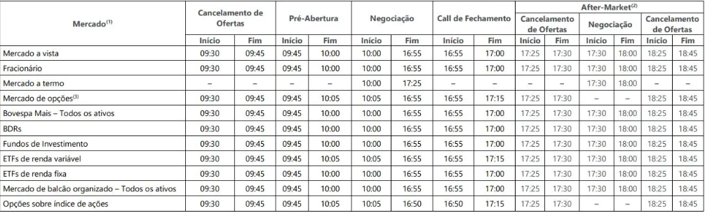Além do mercado à vista, esses horários de negociações incluem também o mercado fracionário, a termo e de opções. Assim como todos os ativos do Bovespa e de balcão organizado, BDRs, fundos de investimento ETFs de renda variável e fixa e opções sobre índices de ações.