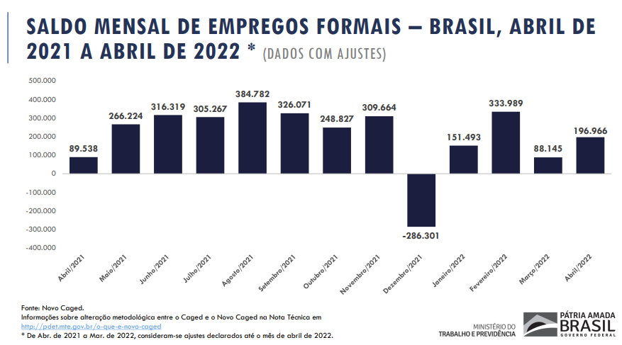 O Brasil criou 196.966 postos e de trabalho formal em abril de 2022, resultado acima da expectativa do mercado. Os números do mês representam um crescimento tanto em relação ao mês de março de 2022 (88.145), quanto a abril de 2021 (89.538).