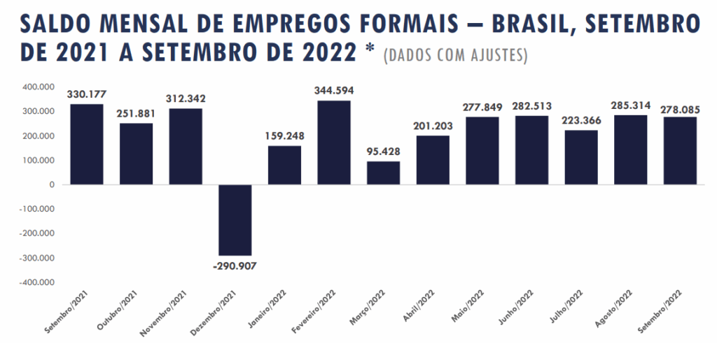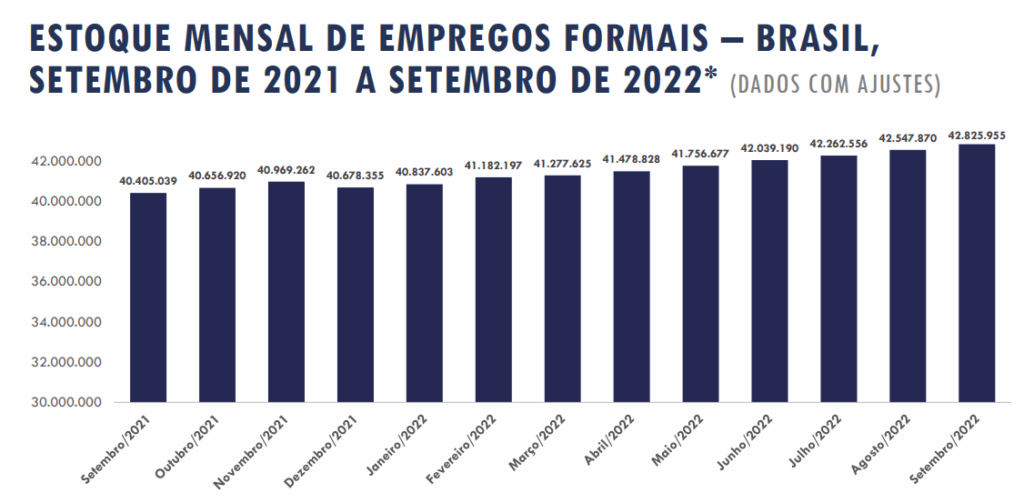 No acumulado do ano de 2022, foi registrado saldo de 2,14 milhões de empregos. Deste total, foram 17,614 milhões de admissões e de 15,466 milhões de desligamentos.