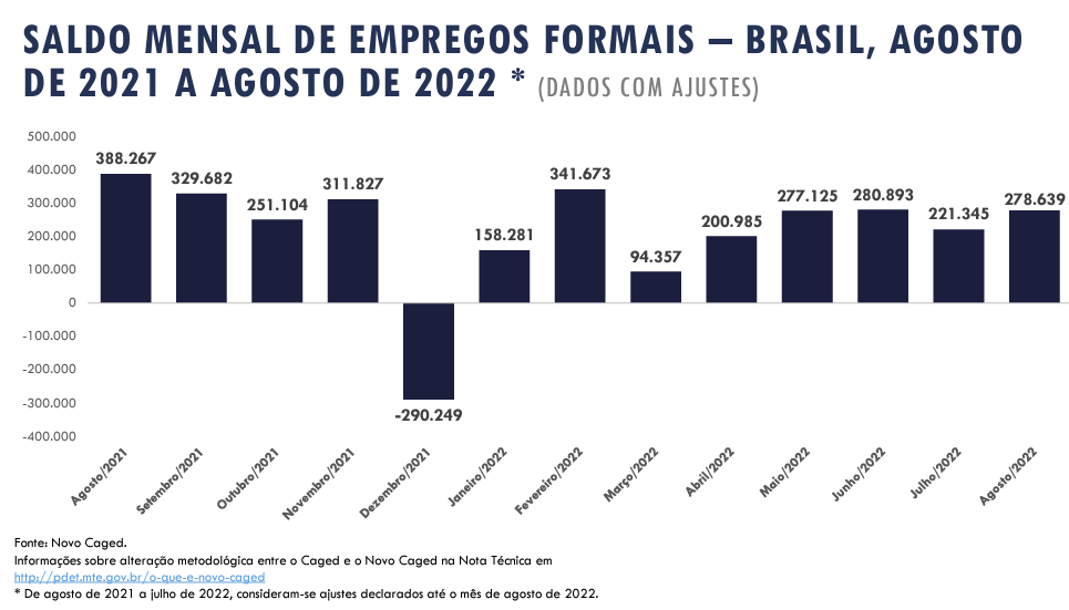 O Brasil criou 278.639 postos de trabalho formal em agosto de 2022, resultado acima da expectativa do mercado e melhor que o mês anterior.