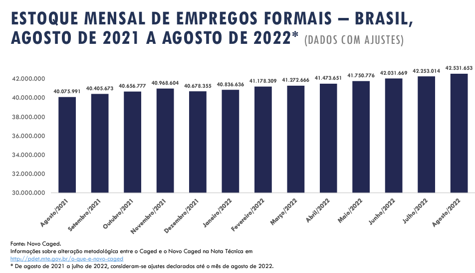 Com isso, o estoque de empregos formais no país atingiu 42,5 milhões, o maior resultado para agosto da série com ajustes iniciada em 2010.
