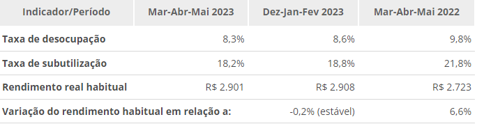 Segundo o órgão, essa é a menor taxa para um trimestre encerrado em maio desde 2015. Na ocasião, a taxa de desemprego ficou também em 8,3%. Por outro lado, a taxa de desocupação caiu 1,5 p.p. em relação ao mesmo período de 2022.
