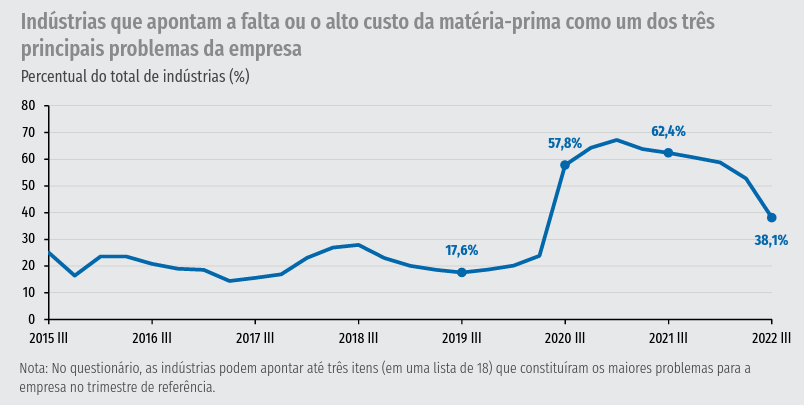 Isso porque, no terceiro trimestre de 2022, a falta ou alto custo de matéria-prima atingiu 38,1% das indústrias, frente a 52,8% no segundo trimestre.