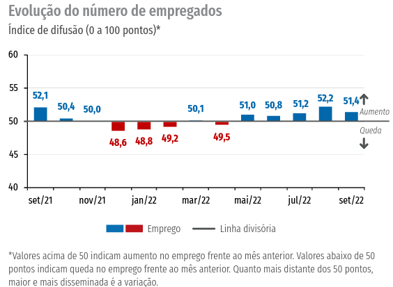 O emprego na indústria brasileira avançou pelo 5º mês consecutivo em setembro. O índice de evolução do número de empregados ficou em 51,4 pontos, acima da linha divisória de 50 pontos, que separa aumento de queda do emprego industrial. Apesar do aumento, o resultado representa desaceleração frente a agosto, que registrou 52,2 pontos.