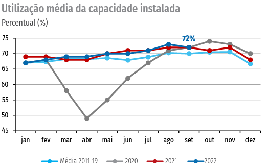 Enquanto isso, a Utilização da Capacidade Instalada (UCI) caiu 1 ponto percentual entre agosto e setembro de 2022, para 72%.