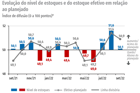 Por outro lado, o nível de estoques de produtos finais na indústria recuou na passagem de agosto para setembro de 2022. O índice de evolução do nível de estoques foi de 50,1 pontos, ou seja, muito próximo da linha divisória de 50 pontos, que indica estabilidade do nível de estoques.