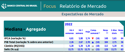 Em tempo, a expectativa para o dólar segue estável há dez semanas, com projeção de R$ 53,20 em 2022 e 2023.