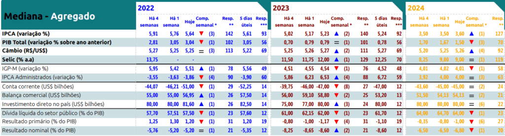 Por fim, quanto ao câmbio, as projeções foram mantidas em R$5,25 para 2022 e tiveram aumento para R$5,27 em 2023.
