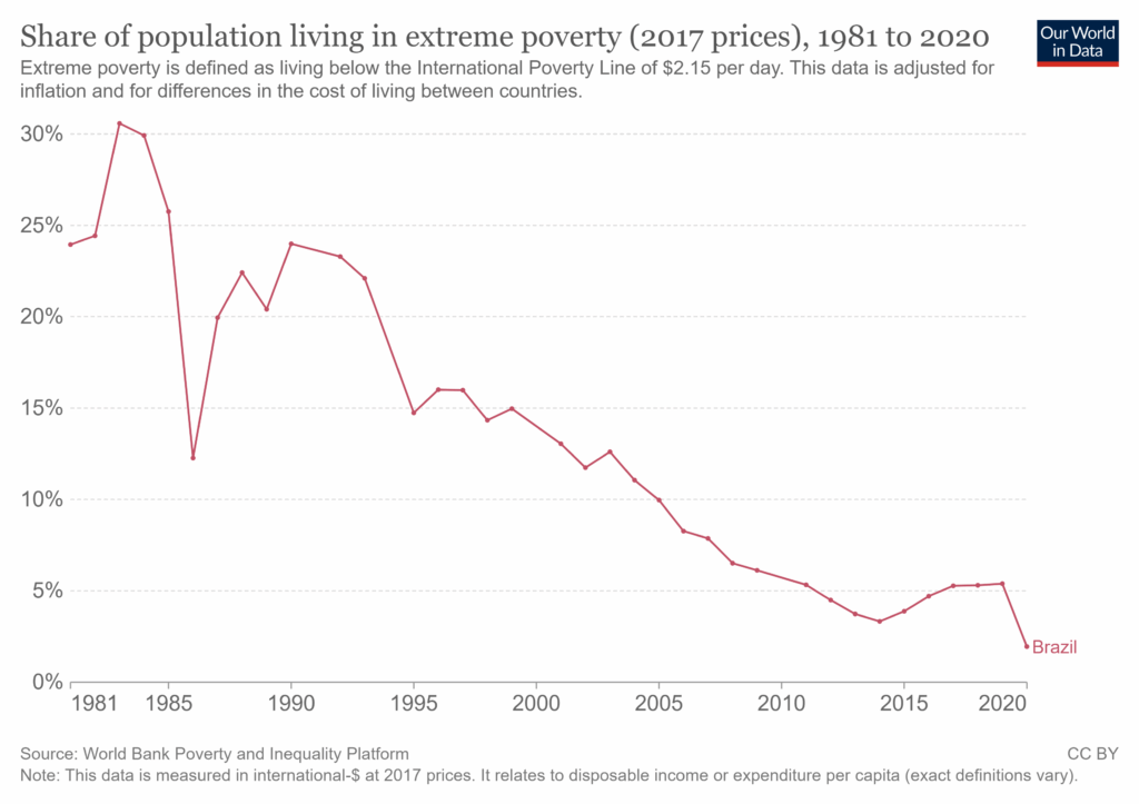 A extrema pobreza no Brasil caiu em 2020 para o menor nível da série histórica, iniciada em 1980. O Banco Mundial atualizou os dados em outubro de 2022, mostrando que o Brasil foi o país que mais reduziu a taxa em toda América Latina.