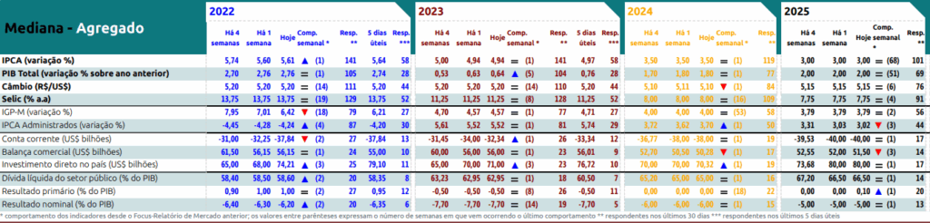 Por fim, quanto ao câmbio, as previsões seguem as mesmas há 14 semanas, tanto para 2022 quanto para 2023. As projeções do dólar estão em R$5,20 nos dois casos.