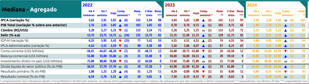 Por fim, quanto ao câmbio, a projeção caiu de R$5,27 para R$5,25 em 2022 e foram mantidas em R$5,25 para 2023.
