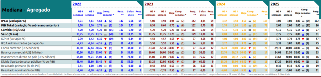 Por fim, quanto ao câmbio, as previsões seguem as mesmas há 15 semanas, tanto para 2022 quanto para 2023. As projeções do dólar estão em R$5,20 nos dois casos.