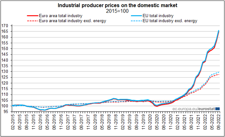 A inflação ao produtor industrial (PPI) na Zona do Euro subiu 43,3% em agosto, na comparação anual. Em julho, a taxa anualizada foi de 37,9%. A Eurostat, escritório de estatísticas da União Europeia, foi quem divulgou os dados hoje (4).