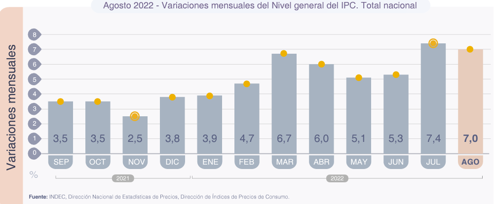 A inflação ao consumidor na Argentina subiu 7% em agosto comparado ao mês anterior. Nos oito primeiros meses do ano a alta é de 56,4%, enquanto nos últimos 12 meses a inflação acumulada chegou ao impressionante patamar de 78,5%.