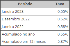 Nos últimos 12 meses, a variação do índice foi de 5,87%, abaixo dos 5,90% observados nos 12 meses imediatamente anteriores. Em janeiro de 2022, o índice ficou em 0,58%.