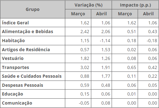 O Índice Nacional de Preços ao Consumidor Amplo (IPCA) apresentou uma alta de 1,06% em abril, número um pouco acima da previsão de 1,00%, segundo dados divulgados pelo IBGE nesta manhã, 11. Esse é o maior patamar do índice desde 1996 (1,26%).