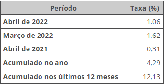 No ano de 2022, o IPCA acumula alta de 4,29%. Já nos últimos 12 meses a alta é de 12,13%.