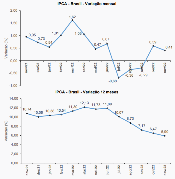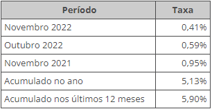 O Índice Nacional de Preços ao Consumidor Amplo (IPCA) subiu 0,41% em novembro, patamar abaixo do esperado pelo mercado. Em novembro de 2021, a taxa foi de 0,95%.
