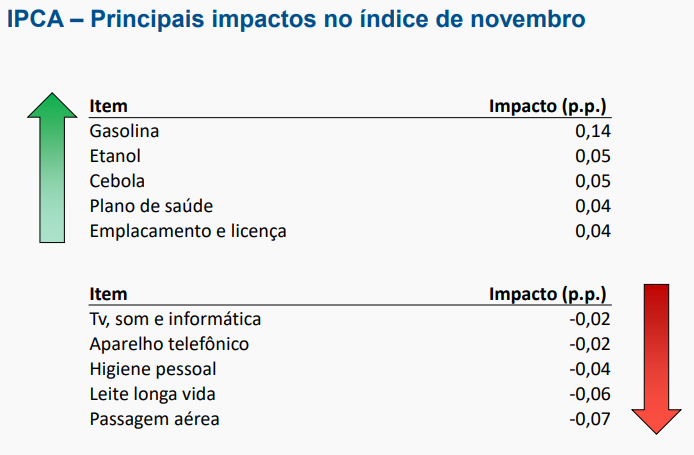 Com isso, juntos, os dois grupos responderam por cerca de 71% do IPCA de novembro. Enquanto isso, a maior alta do mês foi do grupo Vestuário, que subiu 1,22%.