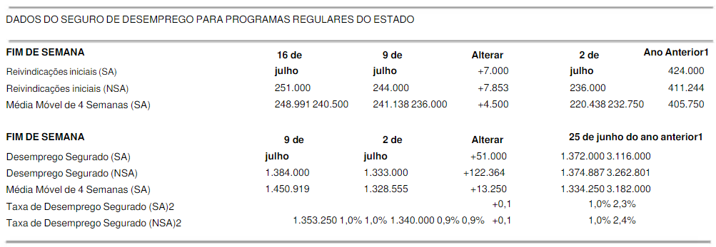 O número de pedidos iniciais de auxílio-desemprego nos Estados Unidos cresceu na semana encerrada em 16/07/2022, totalizando 251 mil, uma elevação de 7 mil pedidos frente ao número não revisado da semana anterior.
