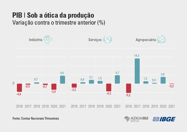 Em 2021, houve crescimento na indústria (4,5%) e Serviços (4,7%) e variação negativa na Agropecuária (-0,2%).