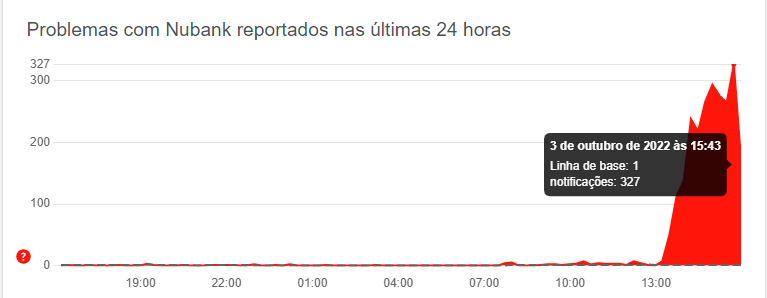Houve um pico de reclamações sobre a falha no app do roxinho por volta das 15h43h, segundo o Downdetector, que monitora problemas em plataformas online.
