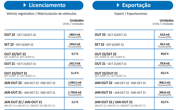 Nas exportações também houve crescimento em outubro. No mês as fabricantes exportaram 42,8 mil unidades, volume quase 50% acima do que saiu do país em setembro de 2022 e 43,5% superior frente a outubro de 2021.