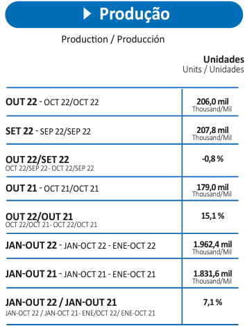 Com isso, a produção acumulada até outubro de 2022 atingiu 1,962 milhão de veículos, alta de 7,1% em relação ao mesmo período de 2021.