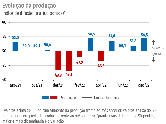 O índice de evolução da produção registrou 54,5 pontos em agosto de 2022, resultado acima da linha divisória dos 50 pontos, o que significa que a produção aumentou ante o mês anterior.