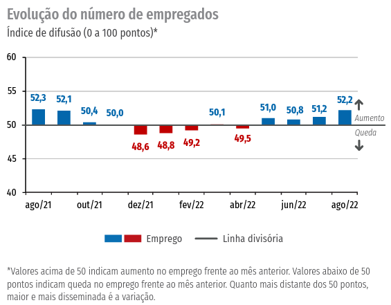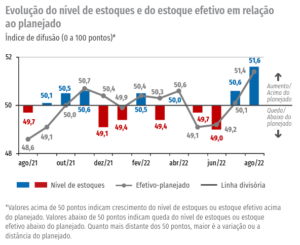 Por outro lado, o nível de estoques de produtos finais na indústria aumentou na passagem de julho para agosto de 2022. O índice de evolução do nível de estoques foi de 51,6 pontos, ou seja, acima da linha divisória de 50 pontos, que indica estabilidade do nível de estoques.