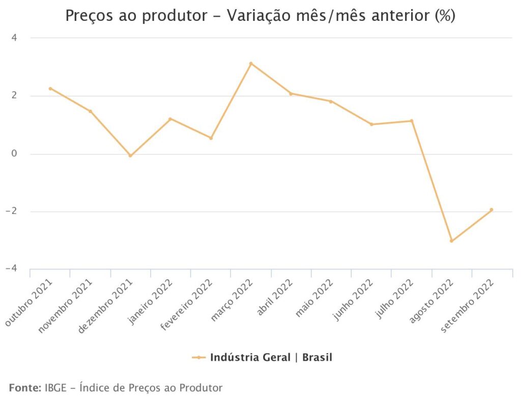 Os preços da indústria caíram 1,96% em setembro, comparados a agosto. O decréscimo representa a 2º maior queda do índice de Preços ao Produtor (IPP) na história da série, iniciada em 2014. Em agosto de 2022 o IPP teve a maior queda da série, de 3,11% (saiba mais).