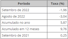 Por outro lado, no acumulado no ano o índice atingiu 5,87% ante 23,90% em setembro de 2021.