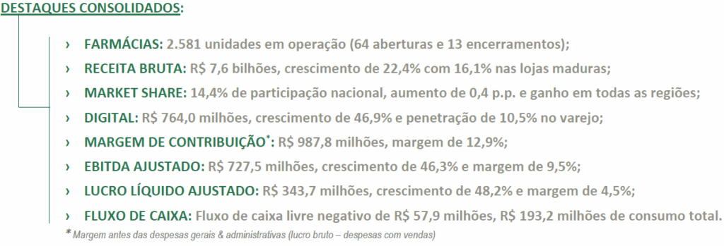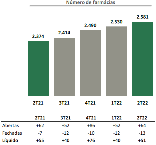 Por fim, a Raia Drogasil desataca que a rede fechou o 2º trimestre de 2022 com 2.581 lojas. A empresa inaugurou 64 unidades e fechou 13 no período.