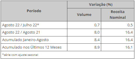 Já na base anual (agosto/21 a agosto/22) houve alta no volume de serviços (8,0%) em 24 das 27 unidades da Federação.