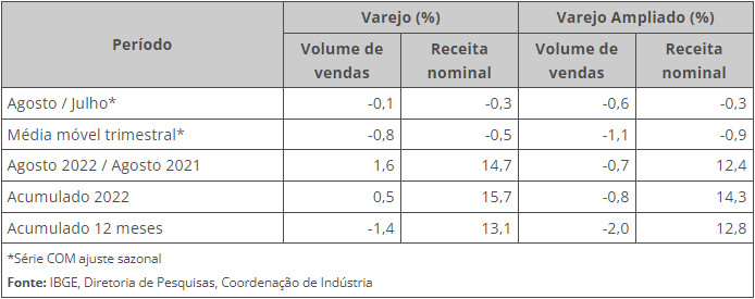 No entanto, comparado a agosto de 2021, o varejo registra alta de 1,6%. No acumulado de 2022, a alta é de 0,5%, enquanto nos últimos 12 meses, há queda de -1,4%.