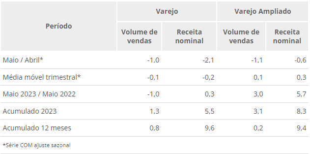 Já na comparação com maio de 2022, a queda das vendas no varejo também foi de 1% na série sem ajuste sazonal. Essa foi a primeira taxa negativa após nove meses de alta. No ano, o indicador acumula alta de 1,3%, enquanto nos últimos 12 meses, registra elevação de 0,8%.