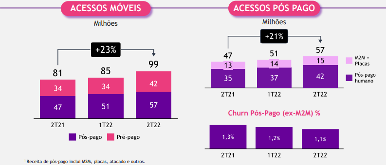 Além disso, a empresa registrou a aceleração do crescimento da base da clientes atingindo 114 milhões de acessos totais. A base de clientes móveis foi responsável por 13,9 milhões de acessos (12,6 milhões provenientes da aquisição da Oi Móvel.